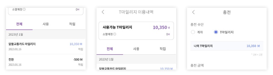 적립된 T마일리지로 페이머니 x알뜰교통카드 잔액을 충전하여 사용할 수 있습니다.